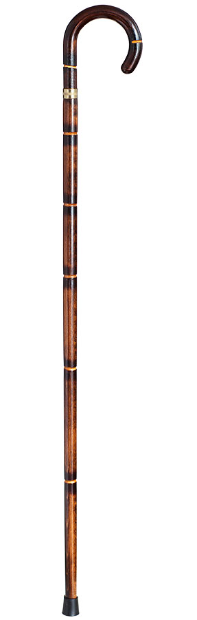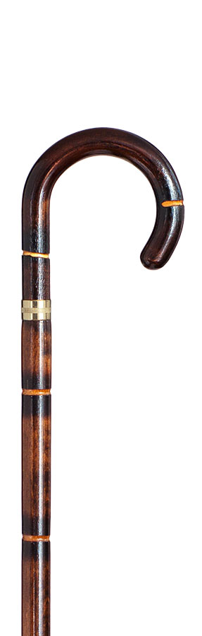 Bastón curvado de una pieza, fabricado en madera de haya oscuro con acabado que imita el junco natural.